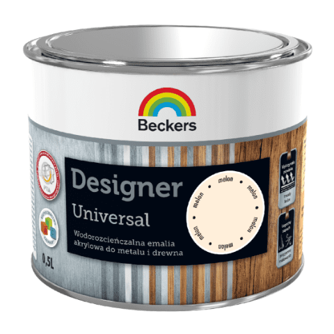 Emalia akrylowa Beckers Designer Universal Frappe 0,5 l o półmatowym wykończeniu jest przeznaczona do dekoracyjno-ochronnego malowania powierzchni drewnianych i drewnopochodnych, takich jak drewniane zabawki, sklejka, płyty pilśniowe, płyty wiórowe i płyty fornirowane, oraz zagruntowanych powierzchni metalowych, lamperii i tynków wewnątrz budynków. Dzięki dodatkowi wosków produkt wykazuje lepsze właściwości aplikacyjne i sprawia, że malowanie jest łatwe i odbywa się bez chlapania. Powłoki, którze tworzą się na powierzchni, przekładają się na jej wysoką odporność na zmywanie, detergenty i zarysowania oraz długą trwałość koloru. Farba jest przyjazna dzieciom – posiada certyfikat zgodności z normą PN-EN 71-3+A2: 2017-12 „Bezpieczeństwo zabawek część 3. Migracja określonych pierwiastków”.