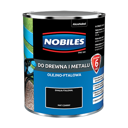 Emalia ftalowa Ftalonal Czarny mat 0,7 l NOBILES tworzy na malowanej powierzchni powłoki charakteryzujące się dobrą przyczepnością do podłoża, elastycznością i bardzo dobrą odpornością na czynniki atmosferyczne. Dzięki temu sprawia ona, że odnowione elementy i konstrukcje zachwycają intensywnym i trwałym kolorem o matowym wykończeniu przez 6 lat. Wystarczy, że nałożysz 2 warstwy w odstępie 16 godzin, a uzyskasz pożądany efekt. Farba jest przeznaczona do malowania elementów metalowych, drewnianych, drewnopochodnych oraz betonowych pokrytych uprzednio farbami podkładowymi lub antykorozyjnymi.
