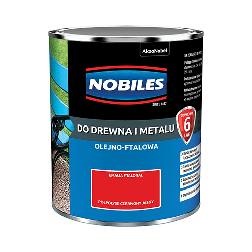 Emalia ftalowa Ftalonal Czerwony Jasny półpołysk 0,7 l NOBILES to nawierzchniowa farba olejno-ftalowa, która służy do ochronno-dekoracyjnego malowania powierzchni drewnianych, drewnopochodnych, stalowych, żeliwnych i betonowych pokrytych uprzednio farbami podkładowymi lub antykorozyjnymi. Dzięki bardzo dobrej przyczepności do podłoża i wysokiemu poziomowi krycia odświeżysz wygląd ogrodzenia, balkonu, altany czy ławki bez nadmiernego chlapania. Ponadto emalia stworzy na malowanej powierzchni powłokę odporną na czynniki atmosferyczne i środki dezynfekujące.