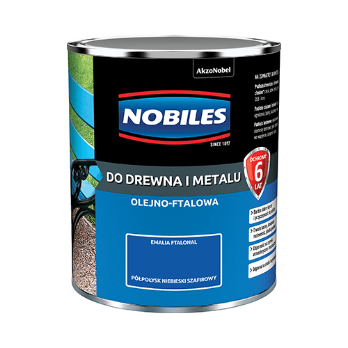 Emalia ftalowa Ftalonal Niebieski Szafirowy półpołysk 0,7 l NOBILES to nawierzchniowa farba olejno-ftalowa, która służy do ochronno-dekoracyjnego malowania powierzchni drewnianych, drewnopochodnych, stalowych, żeliwnych i betonowych pokrytych uprzednio farbami podkładowymi lub antykorozyjnymi. Dzięki bardzo dobrej przyczepności do podłoża i wysokiemu poziomowi krycia odświeżysz wygląd ogrodzenia, balkonu, altany czy ławki bez nadmiernego chlapania. Ponadto emalia stworzy na malowanej powierzchni powłokę odporną na czynniki atmosferyczne i środki dezynfekujące.