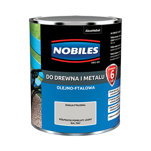 Emalia ftalowa Ftalonal Popielaty Jasny 0,7 l NOBILES to nawierzchniowa farba olejno-ftalowa, która służy do ochronno-dekoracyjnego malowania powierzchni drewnianych, drewnopochodnych, stalowych, żeliwnych i betonowych pokrytych uprzednio farbami podkładowymi lub antykorozyjnymi. Dzięki bardzo dobrej przyczepności do podłoża i wysokiemu poziomowi krycia odświeżysz wygląd ogrodzenia, balkonu, altany czy ławki bez nadmiernego chlapania. Ponadto emalia stworzy na malowanej powierzchni powłokę odporną na czynniki atmosferyczne i środki dezynfekujące.