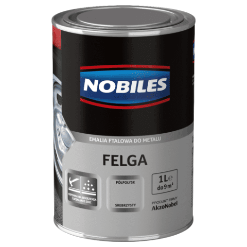 Farba alkidowa Felga Srebrzysta 1 l NOBILES o wydajności 9 m² / l jest przeznaczona do ochronno-dekoracyjnego malowania felg samochodowych oraz elementów metalowych. Po nałożeniu na malowanej powierzchni tworzy się powłoka w półpołysku, która charakteryzuje się dobrą przyczepnością do podłoża i odpornością na różne czynniki pogodowe oraz mechaniczne. Dzięki temu nie tylko wykonasz prace malarskie bez nadmiernego chlapania, ale sprawisz, że odnawiane przedmioty będą świetnie się prezentować przez długi czas.