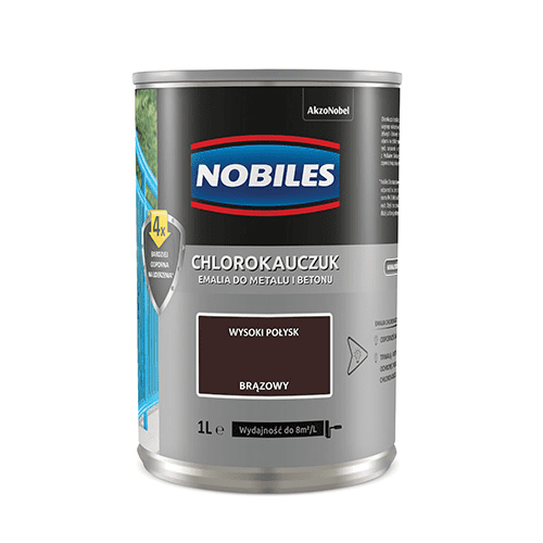 Farba chlorokauczukowa Chlorokauczuk Brązowy 1 l NOBILES jest przeznaczona do ochronno-dekoracyjnego malowania powierzchni stalowych, żeliwnych i betonowych na zewnątrz. Gwarantuje ona 4 razy większą odporność na działanie czynników atmosferycznych, zarysowania i uderzenia. Dzięki temu podłoże zachowa swój intensywny kolor i estetyczny wygląd na dłużej. Pożądany efekt uzyskasz już po nałożeniu 2 warstw produktu za pomocą pędzla lub wałka.