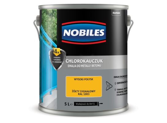 Nobiles Chlorokauczuk to emalia przeznaczona do ochronno-dekoracyjnego malowania powierzchni: stalowych, żeliwnych i betonowych na zewnątrz. Wysoce odporna na działanie czynników atmosferycznych, zarysowania i uderzenia. W zestawie z podkładem Nobiles Nobikor lub Nobiles Podkład Chlorokauczuk zapewnia trwałą ochronę przed korozją Emalia Chlorokauczuk zalecana jest do malowania: konstrukcji stalowych, elementów metalowych ogrodzeń i balkonów itp., eksploatowanych w warunkach atmosfery: miejskiej, wiejskiej i przemysłowejuprzednio zagruntowanych podkładem. Nobiles Chlorokauczuk zapewnia 4 razy większą odporność na uderzenia niż wymaga tego norma PN-C-81608 dla emalii chlorokauczukowych. Dzięki temu pomalowane powierzchnie dłużej zachowują estetyczny wygląd.