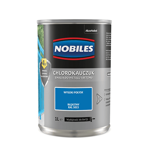Farba chlorokauczukowa Chlorokauczuk RAL 5015 1 l NOBILES jest przeznaczona do ochronno-dekoracyjnego malowania powierzchni stalowych, żeliwnych i betonowych na zewnątrz. Gwarantuje ona 4 razy większą odporność na działanie czynników atmosferycznych, zarysowania i uderzenia. Dzięki temu podłoże zachowa swój intensywny kolor i estetyczny wygląd na dłużej. Pożądany efekt uzyskasz już po nałożeniu 2 warstw produktu za pomocą pędzla lub wałka.