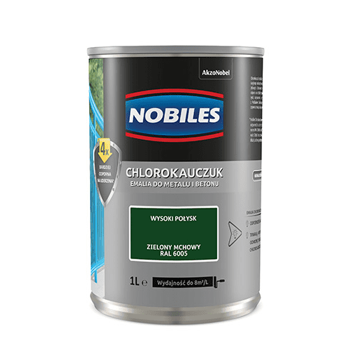Farba chlorokauczukowa Chlorokauczuk RAL 6005 1 l NOBILES jest przeznaczona do ochronno-dekoracyjnego malowania powierzchni stalowych, żeliwnych i betonowych na zewnątrz. Gwarantuje ona 4 razy większą odporność na działanie czynników atmosferycznych, zarysowania i uderzenia. Dzięki temu podłoże zachowa swój intensywny kolor i estetyczny wygląd na dłużej. Pożądany efekt uzyskasz już po nałożeniu 2 warstw produktu za pomocą pędzla lub wałka.
