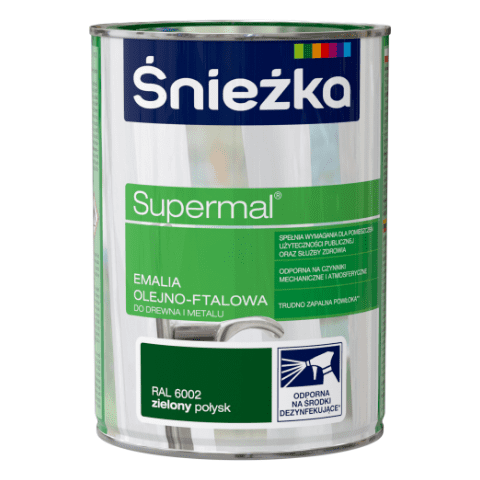 Farba emaliowa olejno-ftalowa Supermal zielony 0,8 l Śnieżka jest przeznaczona do dekoracyjno-ochronnego malowania zarówno wewnątrz, jak i na zewnątrz pomieszczeń. Za jej pomocą odświeżysz wygląd powierzchni drewnianych, materiałów drewnopochodnych, tynków, a także elementów stalowych i żeliwnych. Produkt tworzy trudno zapalną powłokę, która podczas pożaru może zapobiec rozprzestrzenianiu się ognia. Ze względu na wysoką odporność na czynniki mechaniczne oraz środki dezynfekujące produkt sprawdzi się nie tylko w pomieszczeniach mieszkalnych, ale także szpitalach, przychodniach, szkołach i przedszkolach.