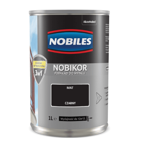 Farba gruntująca Nobikor Czarny 1 l Nobiles jest przeznaczona do ochronnego malowania powierzchni stalowych i żeliwnych pod wyroby: ftalowe, ftalowe karbamidowe, nitrocelulozowe i chlorokauczukowe. Zaawansowana receptura i technologia 3 w 1 sprawia, że produkt bardzo dobrze przyczepia się do malowanej powierzchni, blokuje rdzę oraz chroni powierzchnię nawet przy dużych zmianach temperatur (-20°C ÷ +50°C). Wydajność farby wynosi 12 m² / l przy jednokrotnym malowaniu na gładkim, równym i odpowiednio przygotowanym podłożu.