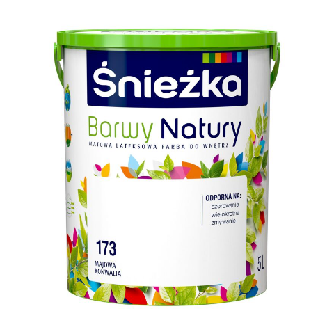 Farba lateksowa Barwy Natury majowa konwalia 173 5 l Śnieżka zapewnia bardzo dobry poziom krycia, dzięki czemu wystarczy nałożyć tylko dwie warstwy emulsji, aby uzyskać pożądany efekt i szlachetne matowe wykończenie. Farba jest przeznaczona do dekoracyjno-ochronnego malowania ścian i sufitów z zapraw cementowych, cementowo-wapiennych, gipsowych, cegły, płyt gipsowo-kartonowych, powierzchni drewnianych i drewnopochodnych, a także tapet z włókna szklanego użytkowanych wewnątrz pomieszczeń.
