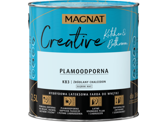 MAGNAT Creative Kitchen&Bathroom to lateksowa farba tworząca powłoki o hydrofobowych i oleofobowych właściwościach. Farba polecana jest szczególnie do dekoracyjnoochronnego malowania ścian i sufitów wewnątrz pomieszczeń narażonych na okresowo zwiększające się zawilgocenie i kondensację pary wodnej, jak: łazienki, pralnie czy kuchnie.