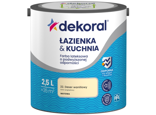 - >Farba lateksowa o podwyższonej odporności ŁAZIENKA & KUCHNIA Deser waniliowy 2,5 l Dekoral