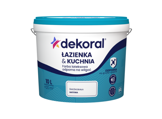 - ZastosowanieDekoral ŁAZIENKA & KUCHNIA Farba lateksowa odporna na wilgoć do malowania ścian i sufitów wewnątrz pomieszczeń szczególnie narażonych na rozwój grzybów pleśniowych oraz na działanie wilgoci, jak: łazienki, kuchnie, piwnice, pływalnie, browary, piekarnie, pralnie itp.