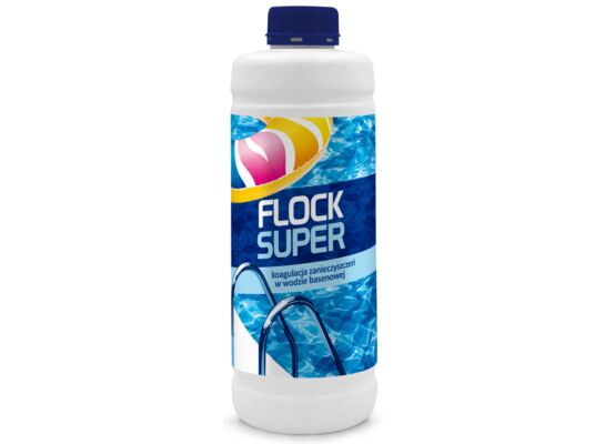 Flock Super 1 l to preparat przeznaczony do klarowania wody basenowej oraz koagulacji zanieczyszczeń. Po jego zastosowaniu z maleńkich zanieczyszczeń powstają większe cząstki, które następnie są zatrzymywane przez filtr lub opadają na dno basenu. Środek można dozować automatycznie lub ręcznie, wlewając go wzdłuż krawędzi basenu i zachowując odpowiednie proporcje – 3 ml preparatu na m³ wody. Płyn działa najlepiej przy pH w przedziale 7,0-7,6.
