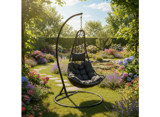 Fotel wiszący łezka łączy nowoczesny design z wyjątkowym komfortem. Jego charakterystyczny kształt przyciąga wzrok, a lekki bujany ruch pozwala na relaks. Fotel został wykonany z trwałego technorattanu, osadzonego na solidnym stalowym stelażu, co zapewnia stabilność oraz odporność na codzienne użytkowanie i warunki atmosferyczne. Wymiary kosza wynoszą 130 x 75 x 68 cm, a średnica stalowej podstawy to 98 cm, przy całkowitej wysokości fotela 192 cm. W zestawie dostępne są także poliestrowe poduszki.