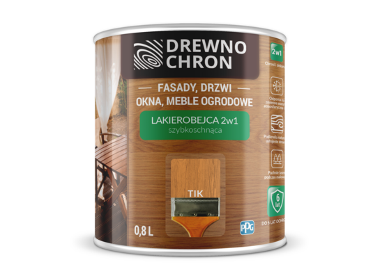 Lakierobejca Drewnochron tik 2w1 zabezpiecza materiał przed skutkami oddziaływania zmiennych warunków atmosferycznych. Dlatego meble ogrodowe, płoty, palisady i altany nie niszczeją pod wpływem promieniowania UV czy wilgoci. Pozostają w świetnym stanie mimo upływu czasu.