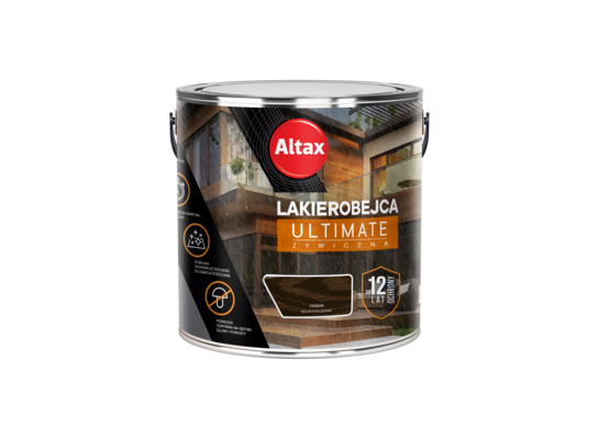 Altax Lakierobjeca Ultimate żywiczna zawiera system nowoczesnych żywic, które odżywiają drewno, jednocześnie skutecznie je zabezpieczając przez szkodliwym działaniem czynników atmosferycznych, chroni także powłokę przed grzybami i glonami. Uzyskany efekt utrzymuje się do 12 lat. Produkt efektowanie podkreśla rysunek drewna, nadając mu piękne, satynowe wykończenie. W palecie dostępnych jest 8 kolorów. Produkt należy stosować na drewno oszlifowane. Druga warstwa produktu może być nałożona już po 2h, a odporność na deszcz ma już po 1h!