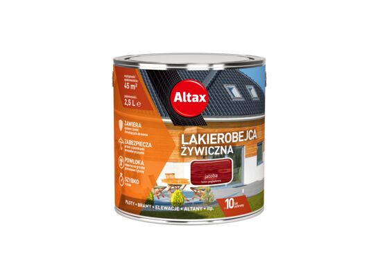 Altax lakierobjeca żywiczna dzięki zastosowanym wysokogatunkowym żywicom, odżywia i zabezpiecza drewno, zapewniając mu trwałość nawet do 10 lat. To wszystko co potrzebuje Twoje drewno, aby cieszyć się jego pięknym wyglądem. Łatwa aplikacja i szybkie schnięcia znacząco skracają czas pracy oraz sprawiają, że praca jest łatwa i przyjemna.