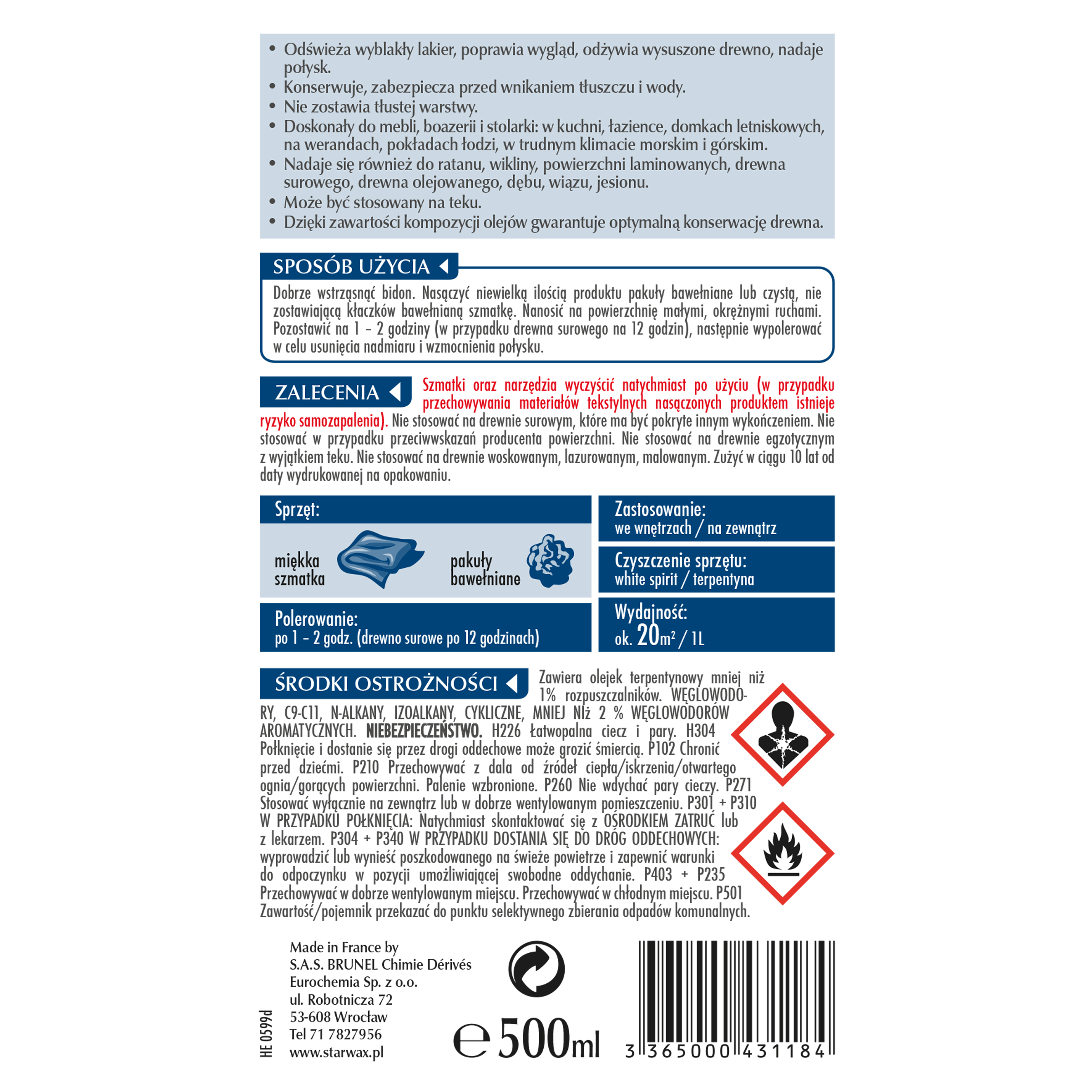 - WłaściwościKonserwuje drewno surowe, olejowane, lakierowane i laminaty