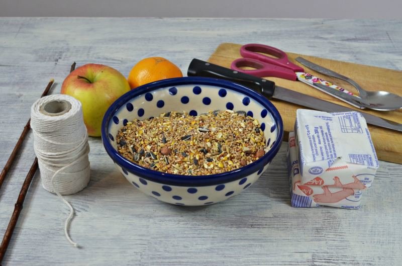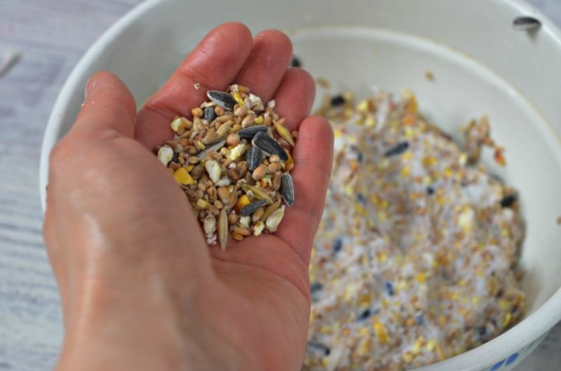 Ptasią karmę lub ziarno mieszamy ze smalcem. Powstanie lepka substancja. Dzięki temu wiatr nie wywieje ziarna ani nie wysypie go jedzący ptak.