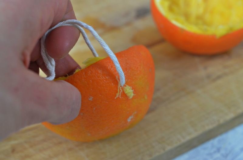 W wydrążonej połówce pomarańczy mocujemy sznurki. Pamiętaj aby sznurek był mocny, ja używałam sznurka bawełnianego.