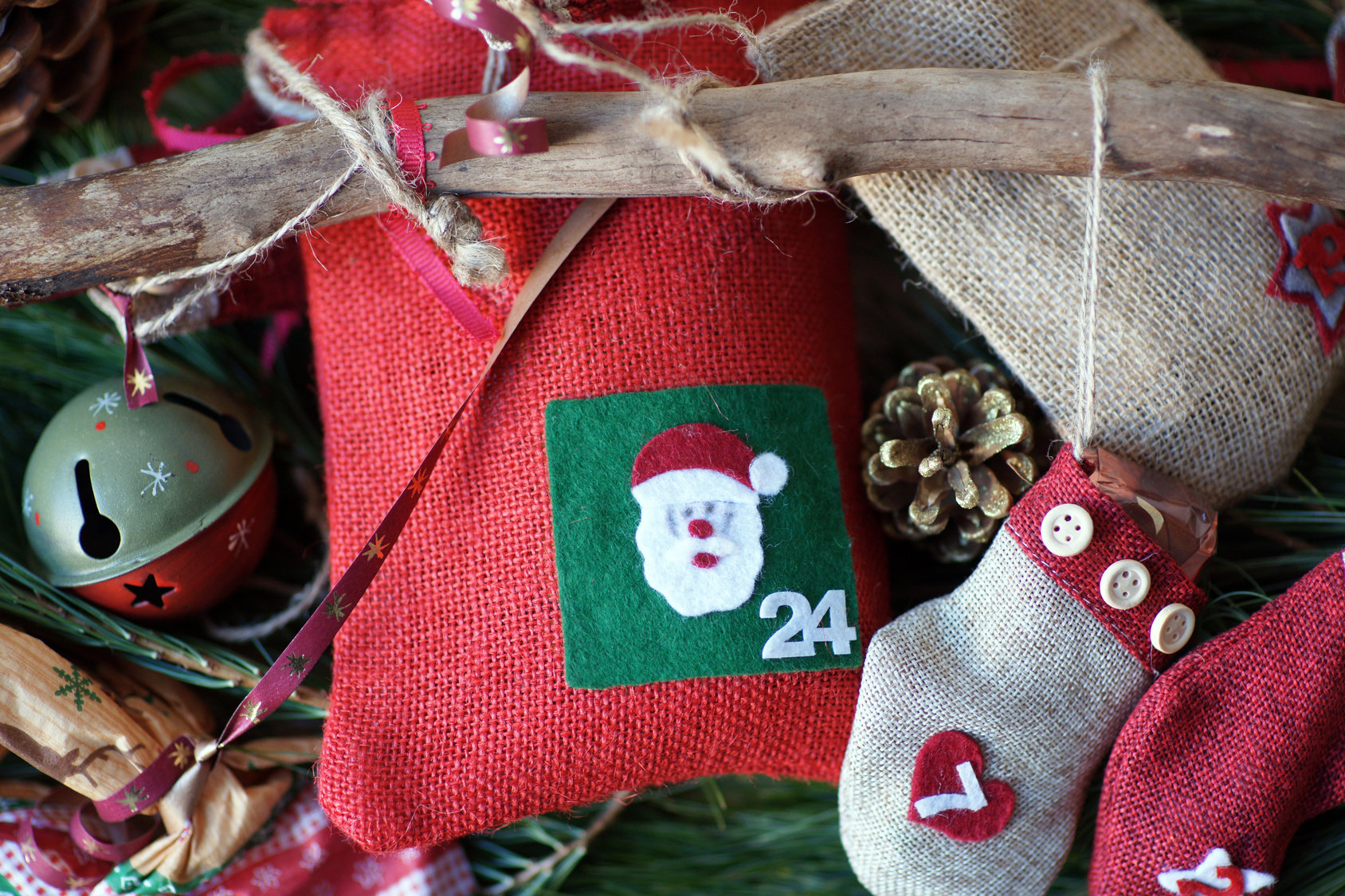 Do wieszaka ubraniowego przywiązujemy kilka żyłek lub sznurków, a do nich przymocowujemy lekkie pakunki z upominkami. Torebek musi być 24, umieszczamy je na różnych wysokościach oraz oznaczamy cyframi. Zamiast wieszaka możesz użyć grubszego patyka, znalezionego na spacerze w lesie lub parku.