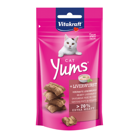 Przysmak dla kota Cat Yums wątróbka 40 g Vitakraft jest przeznaczony dla dorosłych kotów w wieku od 2 lat. Saszetka zawiera 40 g produktu. Delikatnie opiekane paszteciki z widocznym nadzieniem zawierają przede wszystkim mięso oraz 72,9% produktów pochodzenia zwierzęcego, warzywa, roślinne ekstrakty białkowe, drożdże, minerały i produkty pochodzenia roślinnego. Dodatkową zaletą jest obecność tauryny, która wspomaga prawidłową pracę serca i wzroku, a także trawienie tłuszczu.