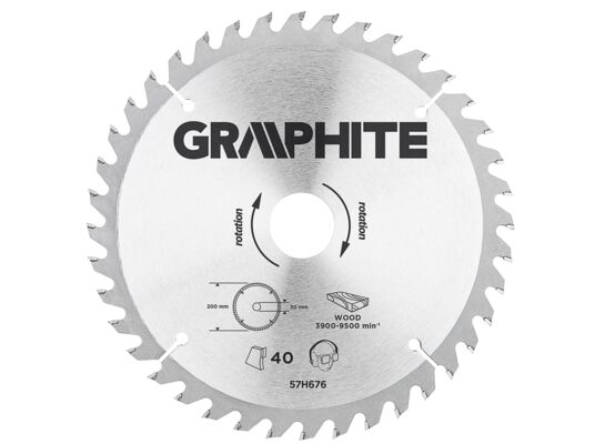 Tarcza do pilarki widiowa GRAPHITE (numer referencyjny 57H676) o średnicy zewnętrznej 200 mm, wykonana ze stopu stali manganowej MN65 o dużej odporności na temperaturę i odkształcenia. Zęby z nakładkami z węglika spiekanego YG6A pozwalają na średnio dokładne cięcie drewna i materiałów drewnopochodnych, takich jak sklejka, płyta wiórowa, MDF. Zawarte w opakowaniu pierścienie redukcyjne umożliwiają zastosowanie tarczy do większości modeli pilarek.