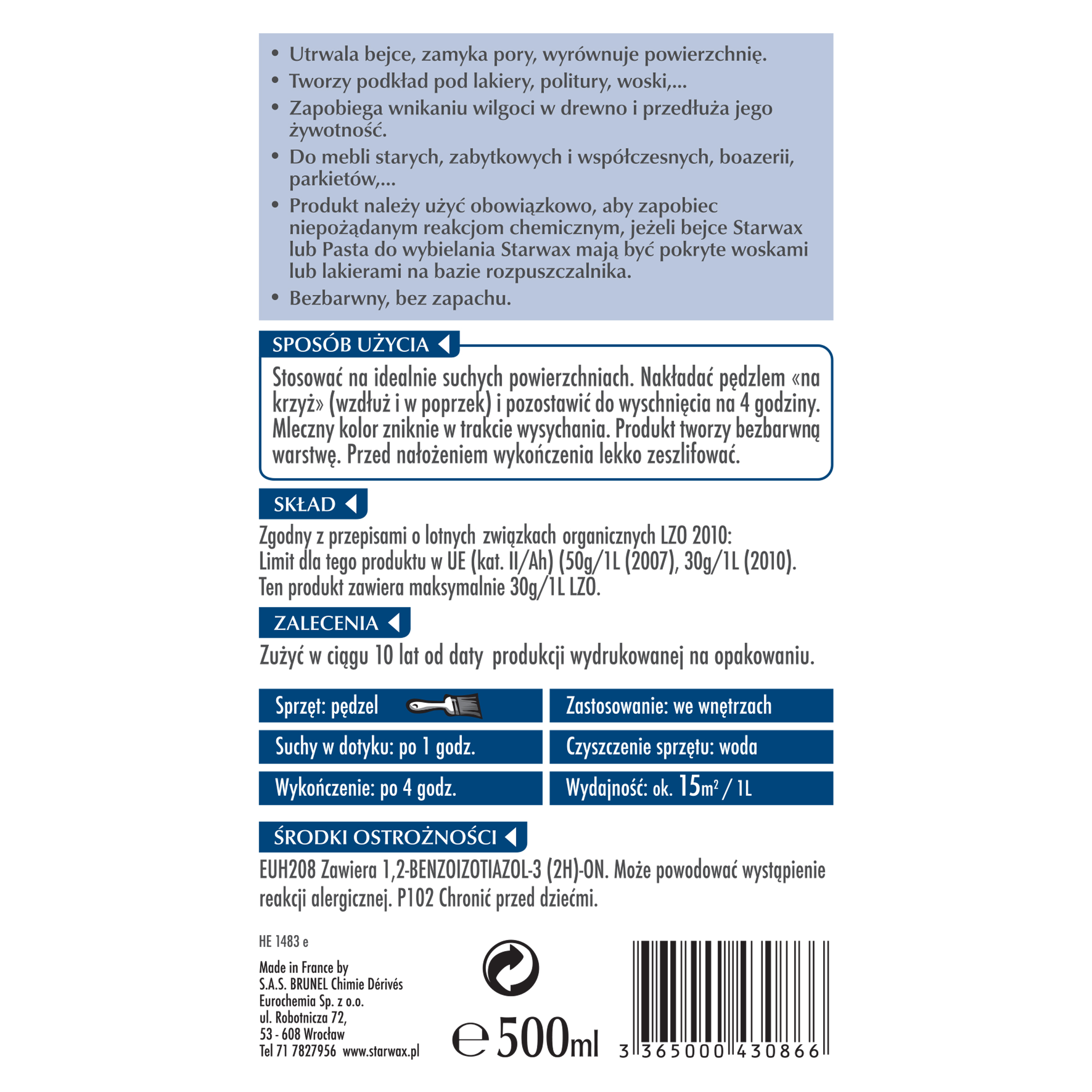 Preparat na bazie wody i żywic akrylowych do utrwalania bejc Starwax oraz Pasty do wybielania Starwax. Doskonały podkład pod lakiery i woski wzmacniający ochronę drewna.