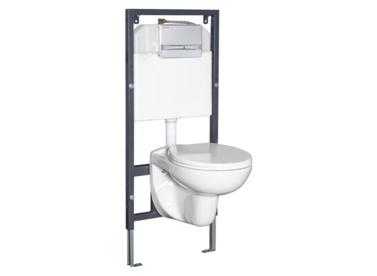 Kompletny zestaw podtynkowy WC z możliwością montażu narożnego lub tradycyjnego. Bardzo mała głębokość montażowa (od 12 cm). Zestaw składa się ze stelaża WC do zabudowy lekkiej, miski WC z bezkołnierzowym systemem spłukiwania, deski wolnoopadającej z duroplastu i przycisku spłukującego w wykończeniu chrom.