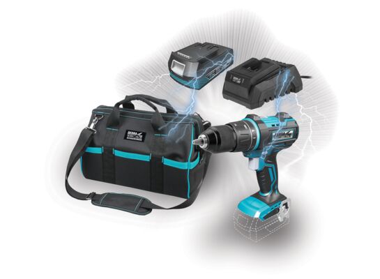 - >Zestaw startowy wiertarko-wkrętarka 18 V Li-Ion akumulator ładowarka torba na narzędzia